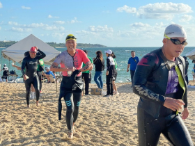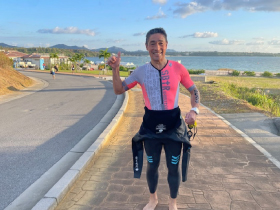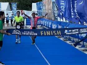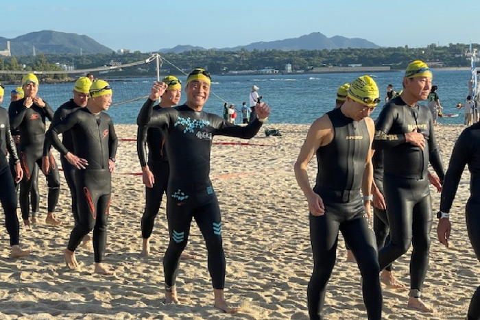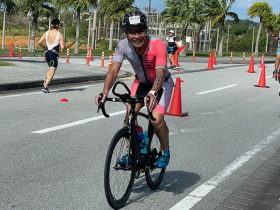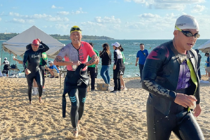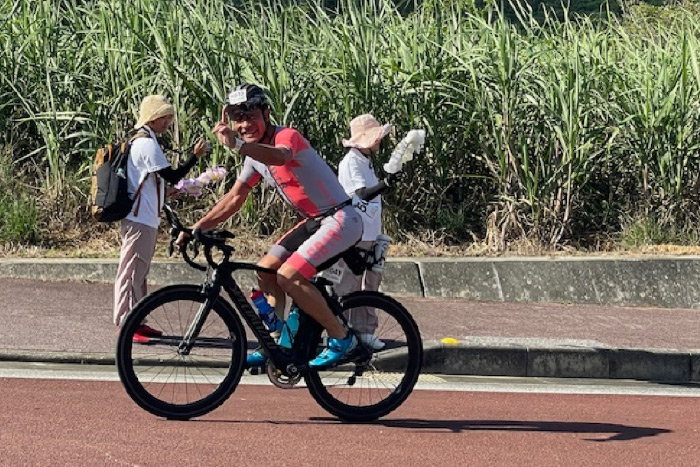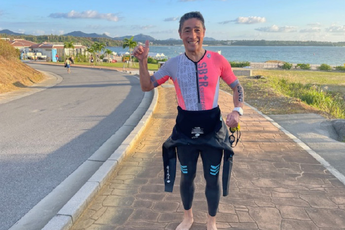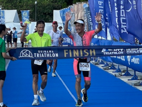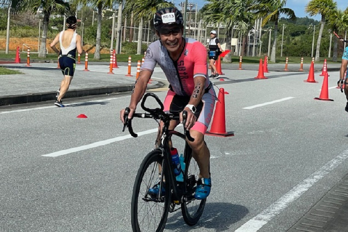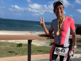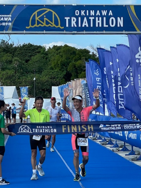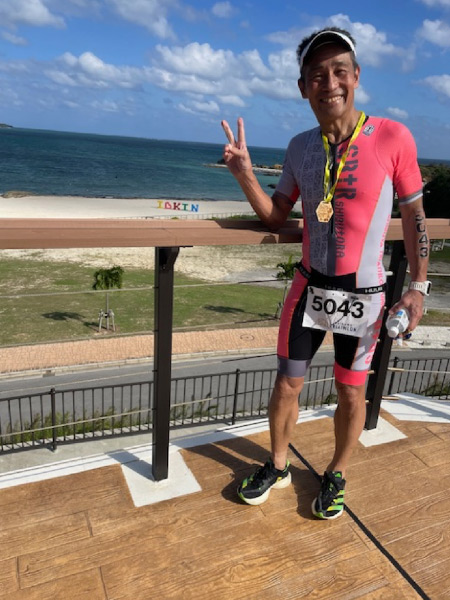 写真を見るとにこやかに余裕でフィニッシュしているように見えますが、実は大変苦しい思いをしたレースでした。スイム〜バイクパートまではまずまず順調でしたが、久しぶりのミドルディスタンス(スイム2q バイク70km ラン22km)だったこともあり、バイクからランに入ってからは完全に脚が止まりました。仲間の選手たちに次々とかわされ、最後は歩くようなスピードになり、ゴール200m手前で身体中が痙攣し転倒、10分間程立ち上がることができませんでした。この原稿を執筆している直前、年齢制限(65歳まで)で来年がラストチャンスとなる「宮古島トライアスロン」の抽選結果が届き、見事当選、来年4月には15年ぶりにロングディスタンスのトライアスロンに挑戦です。今回の苦労を糧としながら、ゆっくりじっくり鍛えてラスト宮古に備える所存、どうか応援よろしくお願いします!!